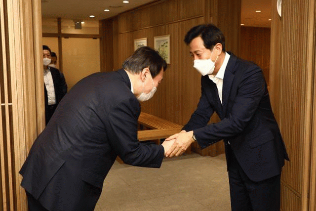 윤 전 총장은 26일 서울시청을 방문해 오 시장과 약 25분간 회동을 했다. 당초 윤 전 총장은 전날 이준석 국민의힘 대표와의 '치맥 회동' 이후 오 시장을 만나려 했으나 강화된 방역수칙을 감안해 취소했다. 두 사람이 대면한 것은 지난 1일 비공개 만찬 이후 25일 만이었다.